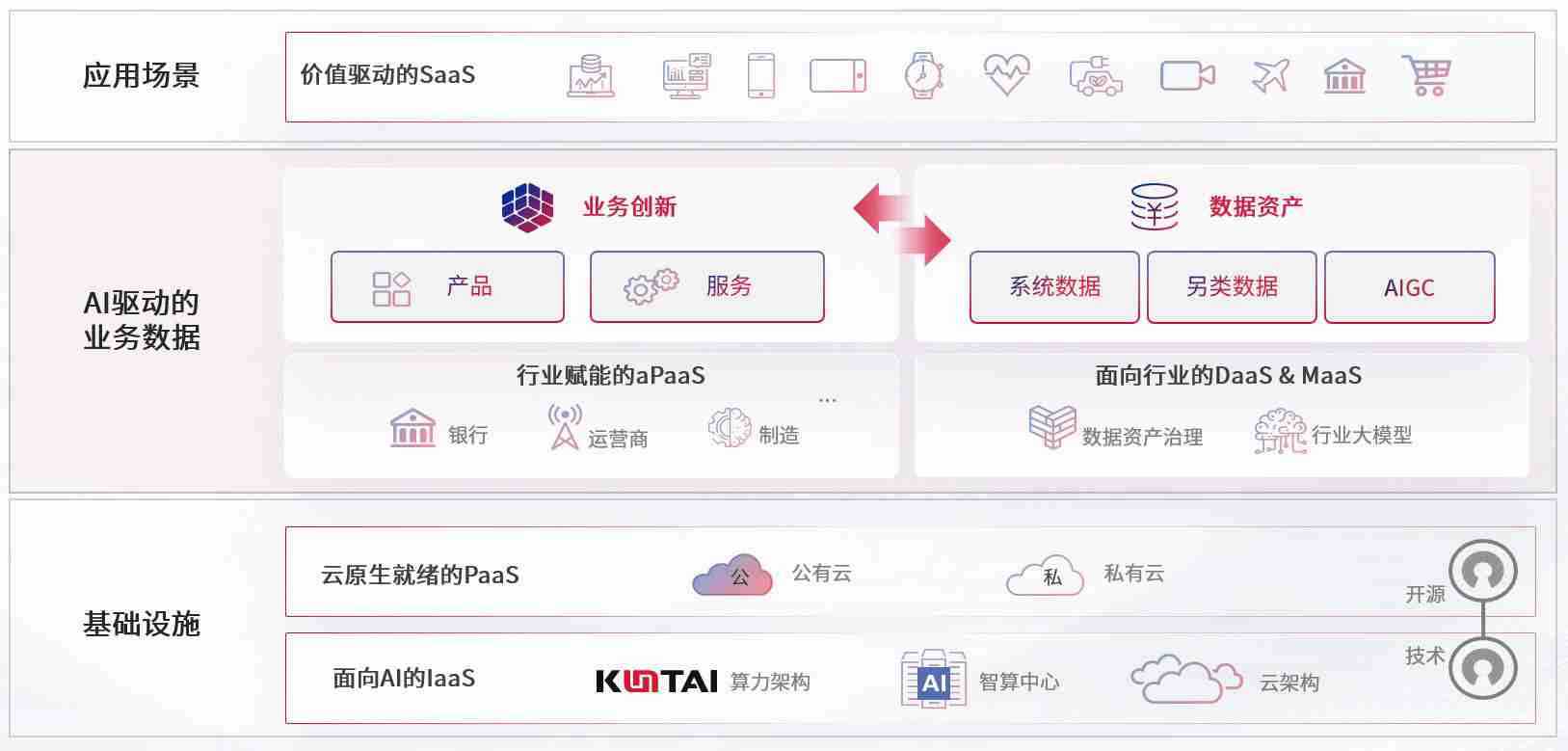 数字时代,,,围绕企业数字化转型的关键要素,,,,PG娱乐数码开创性的提出数云融合战略和技术体系框架,,,,着力在云原生、、、、数字原生、、AI原生和信创产业上架构产品和服务能力,,为处在不同数字化转型阶段的快消零售、、、、汽车、、、、金融、、医疗、、政企、、教育、、运营商等行业客户提供泛在的敏捷IT能力和融合的数据驱动能力,,,,构建跨界融合创新的数字业务场景和新业务模式,,,,助力企业级客户建立面向未来的核心能力和竞争优势,,全面推动社会的数字化、、、智能化转型升级。。。